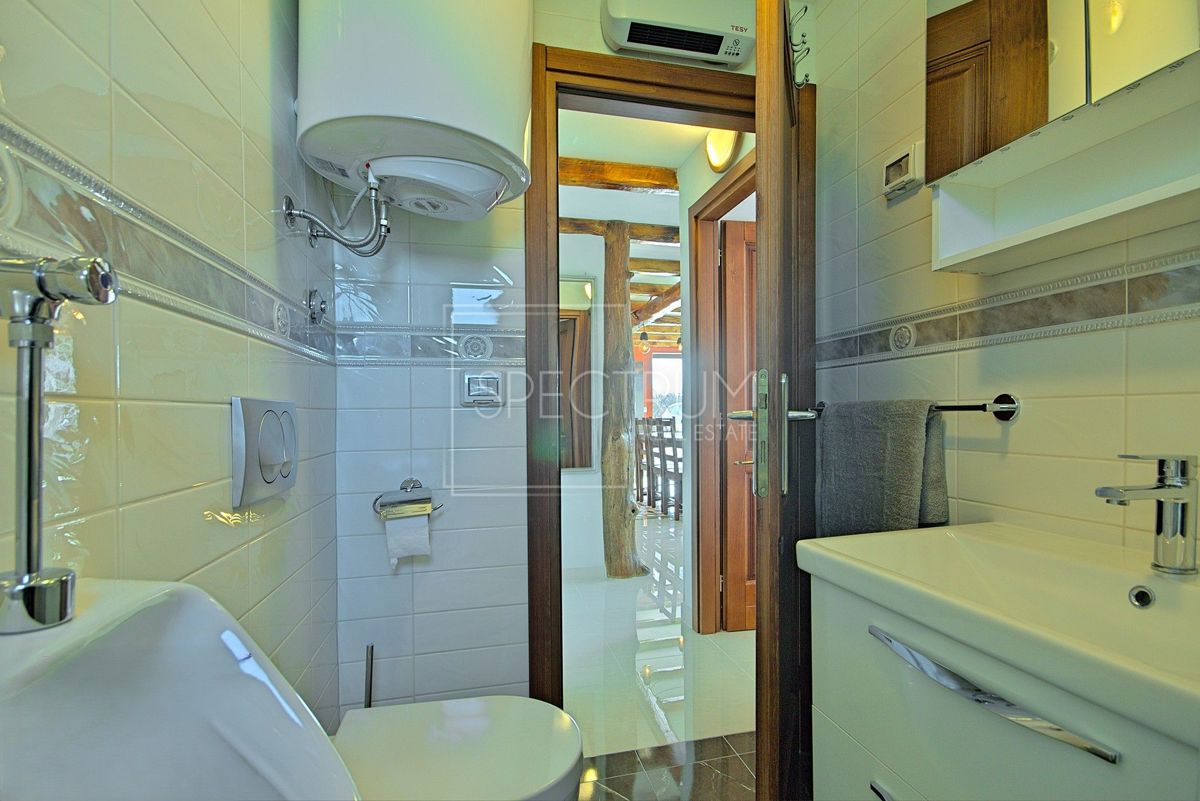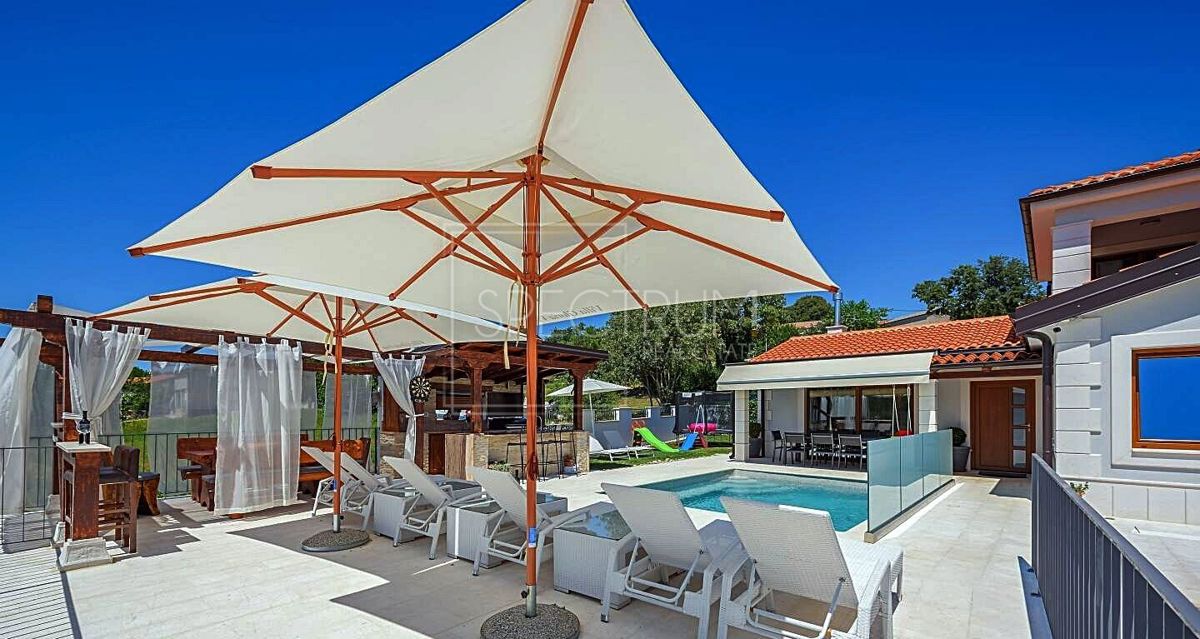 Istra, okolica Brtonigle Na mirni lokaciji v bližini Brtonigle je naprodaj samostojna vila z bazenom. Skupna bivalna površina je 172 m2. Vila se razteza čez pritličje in prvo nadstropje. V pritličju je dnevna soba z odprto kuhinjo in jedilnico, 2 spalnici, vsaka s svojo kopalnico, in pralnica. Ena kopalnica ima tudi jacuzzi. Notranje stopnice vodijo v prvo nadstropje, kjer je hodnik in še ena spalnica z lastno kopalnico. Spalnica se odpira na pokrito teraso s čudovitim pogledom na zelenje. Ob vili se nahaja dodatna bivalna enota, ki jo sestavljajo lepo urejena dnevna soba s kuhinjo in jedilnico, spalnica in kopalnica. Ta prostor se lahko uporablja tudi kot gostišče ali kot gostilna, primerna za druženja. Ogrevanje je urejeno s klimo in kaminom, ki se nahaja v dnevni sobi. Voda se segreva preko solarnega ogrevanja. Nepremičnina se prodaja opremljena. Vila ima tudi video nadzor. Vila se nahaja na zemljišču velikosti 538 m2, od tega je 366 m2 urejenega vrta. Na vrtu je bazen s prostorom za sončenje in pokrita letna kuhinja z žarom in nadstreškom. Ta del vrta je idealen za uživanje in sprostitev v toplih poletnih mesecih. Preostali del vrta zapolnjuje urejena zelena trata, za katero je urejen namakalni sistem. Za hišo je kurilnica in zunanji tuš. Vila ima tudi pokrit prostor za več parkirnih mest. Prikazana cena je cena z DDV. Vila se nahaja v majhni in mirni istrski vasici, le nekaj minut vožnje od Brtonigle, kot tudi od Novigrada in lepih plaž. V bližini se nahajajo trgovine, restavracije, kavarne, vinotoči, šola, vrtec, park, igrišče, avtocesta in razni drugi objekti. Glede na to, da gre za lepo urejeno vilo z bazenom na iskani lokaciji, je vila idealna za mirno družinsko življenje, pa tudi za oddih in nadaljevanje uveljavljene dejavnosti turističnega oddajanja.