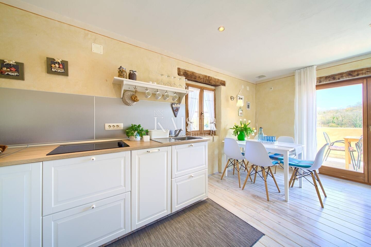 Dobrinj je slikovita zgodovinska vasica, ki se nahaja na severovzhodnem delu otoka Krk, na vrhu hriba, s katerega se odpira čudovit razgled na okoliške zelene doline in morje. Njegova zgodovina sega daleč v preteklost, kraj pa je znan po bogati kulturni dediščini, pristni arhitekturi in ohranjenem tradicionalnem otoškem ambientu. Kaiser Immobilien predstavlja to očarljivo hišo velikosti 71,47 m², ki se nahaja v mirnem okolju s čudovitim pogledom na naravo in morje v daljavi. Leži le 3,5 km od najbližje peščene plaže in ponuja popolno kombinacijo zasebnosti, naravnega okolja in udobja sodobnega življenja. Do vile se pride po ozkih mestnih ulicah ali 300 metrov dolgi makadamski cesti. Hiša ima dva ločena vhoda – enega v pritličju in drugega v nadstropju, kar omogoča funkcionalno razporeditev prostora. V prvem nadstropju (22,43 m²) se nahaja svetla dnevna soba, povezana z novo, celohišno opremljeno kuhinjo s pomivalnim strojem in kombiniranim hladilnikom. Dnevna soba se odpira na prostorno teraso v izmeri 10,45 m², s katere se ponuja spektakularen pogled na morje, zelene griče in Kvarnerski zaliv. V pritličju (29,42 m²) je udoben dnevni prostor, opremljen s satelitsko TV in raztegljivim kavčem (160x200 cm), kopalnica s tušem (3,93 m²) in ločena spalnica (11,70 m²) z zakonsko posteljo (160x200 cm). V mansardi (16,32 m²) je še ena prostorna spalnica z zakonsko posteljo (160x200 cm) in lastno kopalnico (3,30 m²). Klimatska naprava je urejena z napravo Korel. Etaži sta povezani s spiralnimi stopnicami. 450 m2 velik vrt vile je popolnoma zasnovan za uživanje na prostem. Masažna kad, zunanja kuhinja z žarom, jedilna miza, ležalniki in zunanji tuš ustvarjajo idealen kraj za sprostitev v toplih dneh. Za hladnejše mesece je na vrtu še dodatna hišica z WC-jem in infra savno. Nepremičnina ima lastno parkirišče, vse ključne vsebine pa so v neposredni bližini – pošta, supermarket in dve restavraciji z lokalno hrano so le 150 metrov od hiše, na glavnem trgu. Ogrevanje je zagotovljeno s klimatsko napravo in pečjo na drva, ki se nahaja v pritličju, kar omogoča udobno bivanje skozi vse leto. Ta hiša je popoln kraj za sprostitev v miru in naravi, bodisi kot idealno družinsko zatočišče, vikend dom ali naložba za turistični najem. Bližina vsebine: Trgovina: 100 m Restavracija: 100 m Plaža: 3,5 km Igrišče: 100 m Razgledišče: 150 m Pošta: 100 m Malinska: 9 km Krk: 14 km Vrbnik: 13 km Letališče: 17 km Dobrinj- Ljubljana: 150 km Dobrinj- Budimpešta: 500 km Dobrinj- München: 550 km Dobrinj- Dunaj: 520 km Dobrinj- Praga: 850 km Agencijska provizija za kupca znaša 3% + DDV in se plača v primeru nakupa nepremičnine, ob sklenitvi prvi pravni akt. ID-KODA: 127-054 Če si želite nepremičnino ogledati osebno, kontaktirajte: Jennifer Hofmann E-pošta: jennifer@kaiser-immobilien.hr Tel: +385-91-515-0887 http://kaiser- immobilien.hr/
