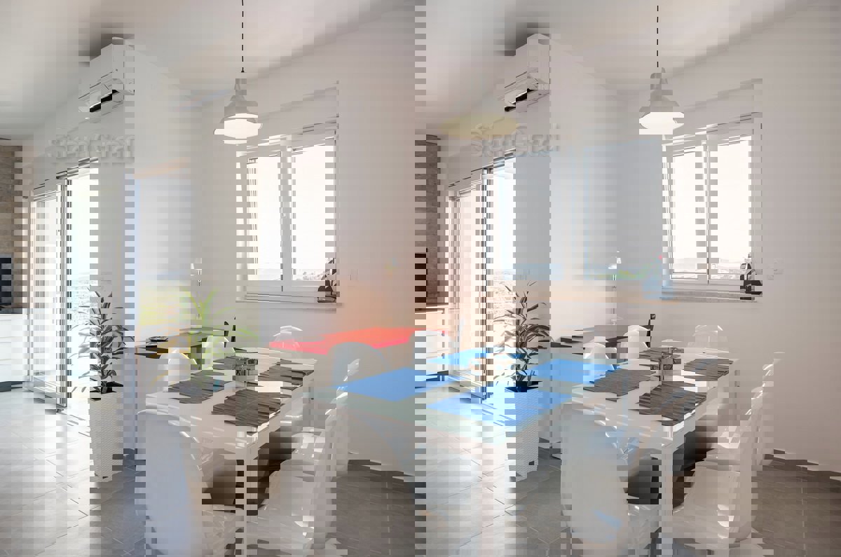 Iz bogate ponudbe nepremičnin agencije Stan Grad Immobilien izstopa zelo luksuzna hiša v regiji otok Krk. Ta nova in izjemno posebna nepremičnina z vrhunsko opremo in sodobnim dizajnom se nahaja v bližini znanega mesta Krk, na mirni in zeleni lokaciji, stran od mestnega vrveža. Hiša avantgardnega videza in visoke kakovosti obsega dve etaži s skupno površino 300 m². Sestavljena je iz štirih ločenih stanovanjskih enot. V pritličju se nahajata dva dvosobna apartmaja, vsak v velikosti 75 m², s svojimi vhodi in terasami. V prvem nadstropju sta še dva dvosobna apartmaja, vsak velik 72 m², prav tako z lastnimi terasami, ki nudijo dodatno udobje. Del posesti je tudi lepo urejena parcela v velikosti 606 m², ki vključuje bazen in prostor za sončenje. Na dvorišču je dovolj prostora za udobno parkiranje več vozil, kar še povečuje funkcionalnost nepremičnine. Zaradi svoje lege hiša ponuja tudi lep pogled na morje in obalo. Nepremičnina je v lasti fizične osebe. Prodajalec jamči za urejeno dokumentacijo in hiter prenos lastništva na kupca. Agencija Stan Grad Immobilien vam bo zagotovila vso potrebno pomoč pri vpisu v zemljiško knjigo in prenosu lastništva ter komunalnih priključkov na vaše ime.