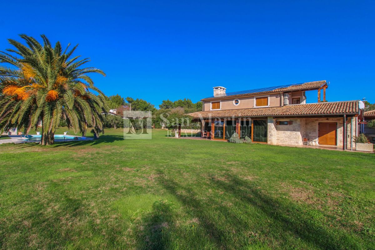 Medulin, Čudovita in Prostorna Posest v Bližini Morja Na peš razdalji od morja in s pogledom nanj se nahaja ta oaza na impresivnih 3336 m². Od mestnih vsebin, kot so trgovine, šola, gostinska ponudba in pošta, je oddaljena le 1 km, kar je idealno za vse, ki iščejo mir in zasebnost v bližini vsega potrebnega za življenje. Hiša na posesti se razteza skozi dve etaži s skupno površino 360 m². V pritličju najdemo dnevno sobo, kuhinjo in jedilnico, vse pa se odpira na pokrito teraso s pogledom na urejeno dvorišče. Tukaj so še ena spalnica s kopalnico, stranišče in pralnica. V prvem nadstropju so tri spalnice in velika kopalnica z masažno kadjo. Ena od spalnic ima svojo teraso, s katere se razprostira čudovit pogled na morje. Na voljo je tudi vrhunska vinska klet. Za dodatno udobje ima hiša centralno ogrevanje in popolno klimatsko napravo. Kamin v pritličju zagotavlja posebno vzdušje, predvsem v zimskih mesecih. Nepremičnina se prodaja popolnoma opremljena z visokokakovostnim pohištvom in opremo ter vključuje videonadzor in alarmni sistem. Sončni kolektorji na strehi zagotavljajo lastno električno energijo in ogrevanje vode. Urejeno in ograjeno dvorišče ponuja številne vsebine, med drugim osvetljeno odbojkarsko igrišče z morskim peskom in otroško igrišče. Na voljo je parkirišče za tri vozila, od tega dve pokriti. Pod parkiriščem se nahaja velik prostor, ki je namenjen wellness coni, ter kurilnica. Ker ima posest dva dostopa, je mogoče dodati dodatno garažo ali parkirišča. Središče dvorišča je čudovit bazen z jacuzzijem s površino 50 m² in lastno sončno teraso. Za zelenje skrbi avtomatski namakalni sistem. Ta nepremičnina se prodaja popolnoma opremljena in urejena, kar jo naredi odlično priložnost, če iščete nekaj mediteranskega in edinstvenega za vaš dom. Poleg tega je uspešna turistična nastanitev z visoko zasedenostjo in ponuja odlično donosnost naložbe.