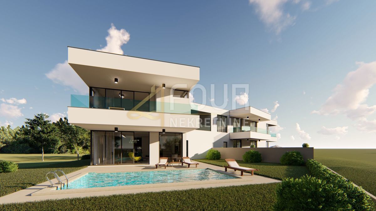 U ponudi imamo sodobno novogradnjo v Omišlju s bazenom in vrtom. Hiša ima skupno površino 185 m2 in je razdeljena na pritličje in nadstropje, med seboj povezana z notranjim stopniščem. V pritličju je predvidena klet s pralnico, vhodni prostor, stranišče, odprto zasnovo dnevne sobe s kuhinjo in jedilnico ter izhodom na teraso s površino 40 m2 in vrt, kjer bo bazen in žar. Prvo nadstropje sestoji iz hodnika, štirih spalnic in treh kopalnic, od katerih dve spalnici imata tudi garderobno sobo, ter izhod na balkone. Hišo odlikuje sodoben dizajn, kakovostna gradnja, klimatizacija vseh prostorov in PVC okna. Na vrtu so predvidena tri parkirna mesta. Predviden datum vselitve je začetek leta 2023. Spoštovani klienti, agencijska provizija se zaračuna v skladu s Splošnimi pogoji poslovanja.