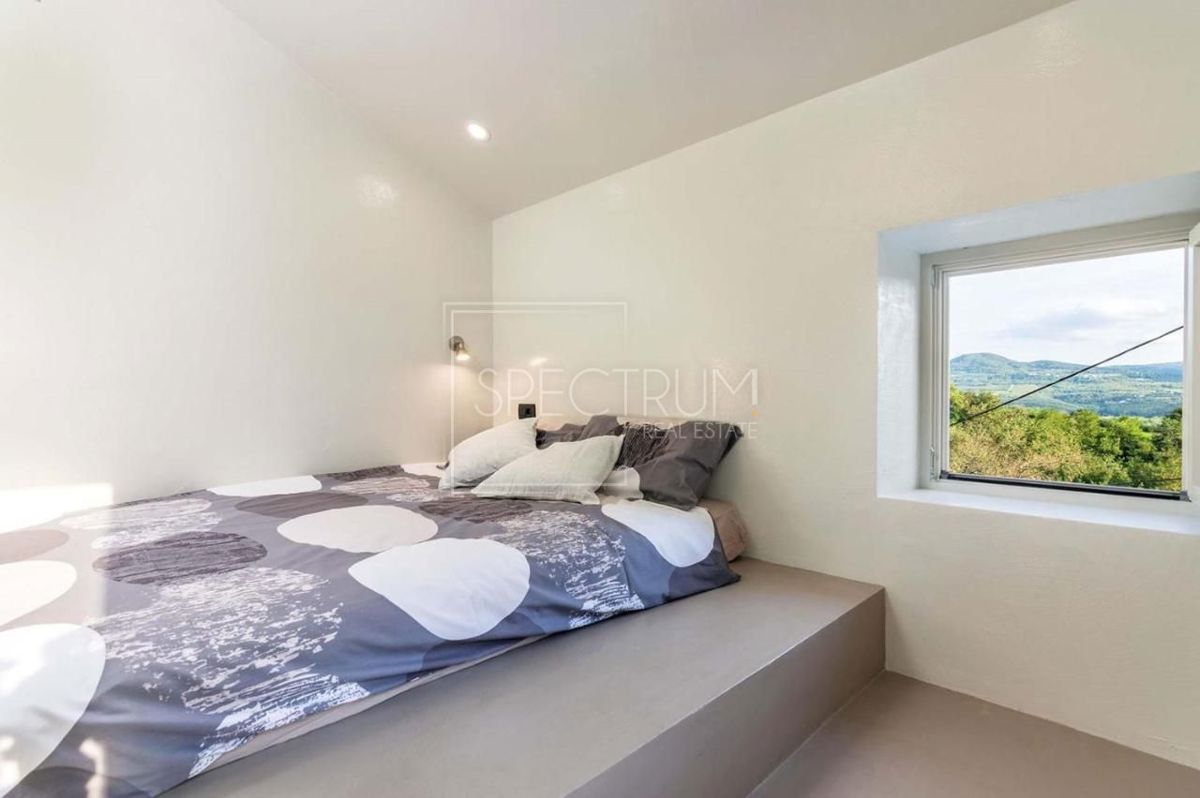 Istra, okolica Oprtlja V okolici Oprtlja se prodaja dizajnerska kamnita hiša z bazenom in čudovitim razgledom. Površina te tradicionalne istrske kamnite hiše je 100 m2, hiša pa se razteza čez pritličje in prvo nadstropje. V pritličju je dnevna soba s kuhinjo in jedilnico ter WC. V ločenem delu pritličja je savna. Notranje stopnice vodijo v prvo nadstropje, kjer je hodnik in 2 spalnici, vsaka s svojo kopalnico. Ena spalnica ima izhod na teraso. Hiša ponuja lep in odprt pogled na prelepo istrsko pokrajino. Ogrevanje je urejeno preko klime, talnega gretja in kamina. Hiša se prodaja opremljena. Hiša je bila v celoti prenovljena leta 2015. Pri rekonstrukciji je bil uporabljen istrski kamen, s čimer je hiša ohranila svojo pristno obliko, sama notranjost pa je bila opremljena z visokokakovostnim, po meri izdelanim dizajnerskim pohištvom, ki daje hiši pridih modernosti. Dvorišče je prostorno in ograjeno, kar zagotavlja mir in zasebnost novim lastnikom. Ob hiši je terasa idealna za druženje in uživanje na prostem. Na vrtu je ogrevan bazen v izmeri 24 m2 s prostorom za sončenje ob njem. Ob bazenu je tudi zunanja shramba. Hiša ima svoj ločen dostop do parcele, poleg hiše pa je tudi parkirni prostor. Hiša se nahaja v majhni in mirni istrski vasici, nedaleč od Oprtlja in Motovuna. V bližini se nahajajo restavracije, kmečki turizmi, vinoteke, sprehajalne poti, kolesarske poti in razni drugi objekti. Ker gre za prenovljeno kamnito hišo z bazenom in odprtim pogledom na naravo, je hiša idealna za vse ljubitelje majhnih istrskih mest in istrske arhitekture ter se lahko uporablja za počitnice in turistične namene, pa tudi za mirno bivanje skozi vse leto.