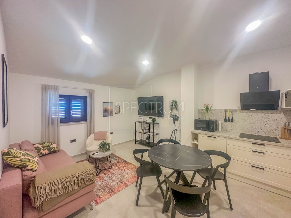 Istra, Tar V bližini Poreča je naprodaj moderno opremljeno stanovanje s pogledom na morje. Stanovanje se nahaja v 2. nadstropju manjše stanovanjske stavbe. Površina stanovanja je 58,12 m2. Stanovanje obsega prostorno dnevno sobo s kuhinjo in jedilnico, 2 spalnici, hodnik, kopalnico in WC. Apartma ponuja pogled na morje. Stanovanje je ogrevano s klimo, v kopalnici talno gretje, obstaja pa tudi možnost vgradnje peči na drva. Stanovanje je bilo lani v celoti prenovljeno. Stanovanje se prodaja v celoti opremljeno in opremljeno. Glede na to, da je popolnoma prenovljena stavba, v kateri se stanovanje nahaja, pravzaprav tradicionalna istrska stavba, je za celotno stavbo, vključno s stanovanjem, značilna izrazita debelina sten. Tik ob objektu je parkirišče. Stanovanje je vključeno v sistem DDV, navedena cena pa vključuje DDV. Apartma se nahaja v centru majhnega mesta nedaleč od Poreča. Lepe in urejene plaže so oddaljene 2,5 km. Središče Poreča je oddaljeno le nekaj minut vožnje. V neposredni bližini stanovanja se nahajajo šola, vrtec, park, igrišče, trgovina, restavracije, kavarne, banka, pošta in razni drugi objekti potrebni za življenje. Glede na to, da gre za moderno in kvalitetno opremljeno stanovanje v bližini različnih vsebin, je stanovanje idealno za celoletno bivanje, novi lastnik pa lahko nadaljuje že utečeno dejavnost turističnega oddajanja.