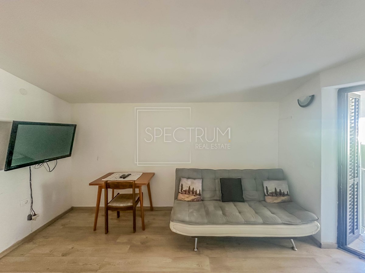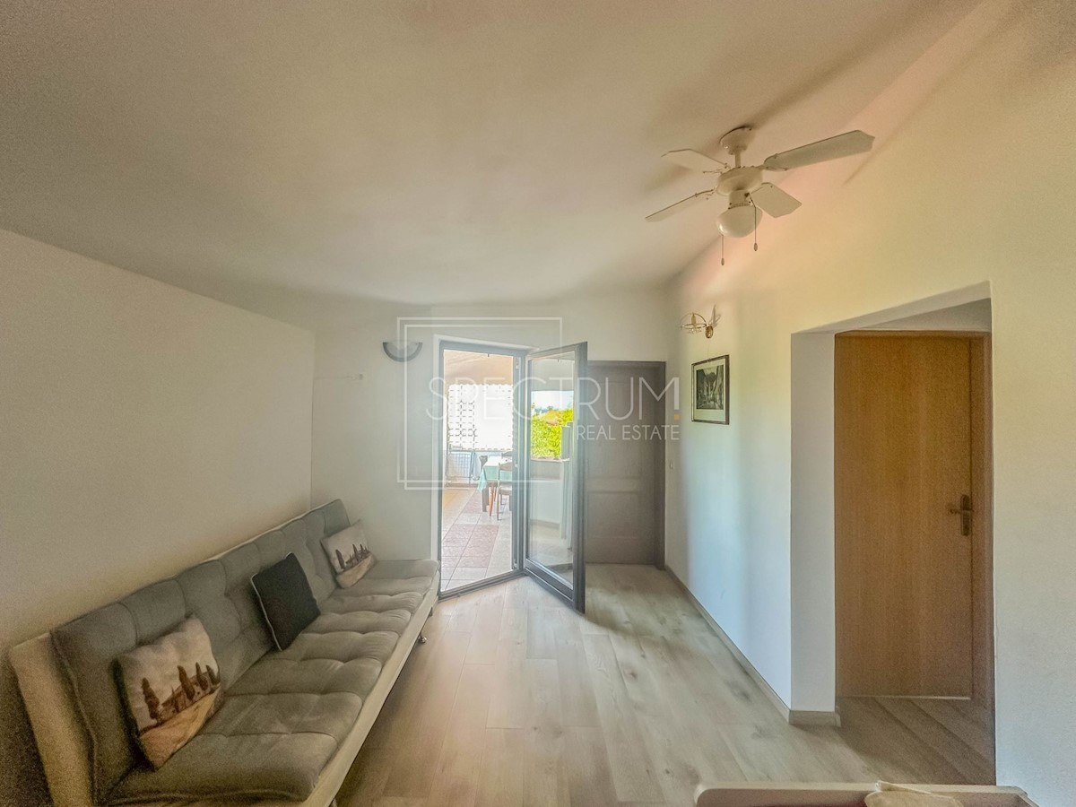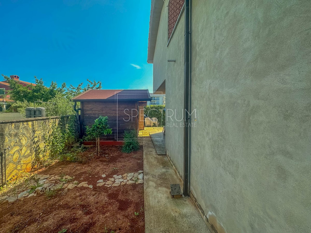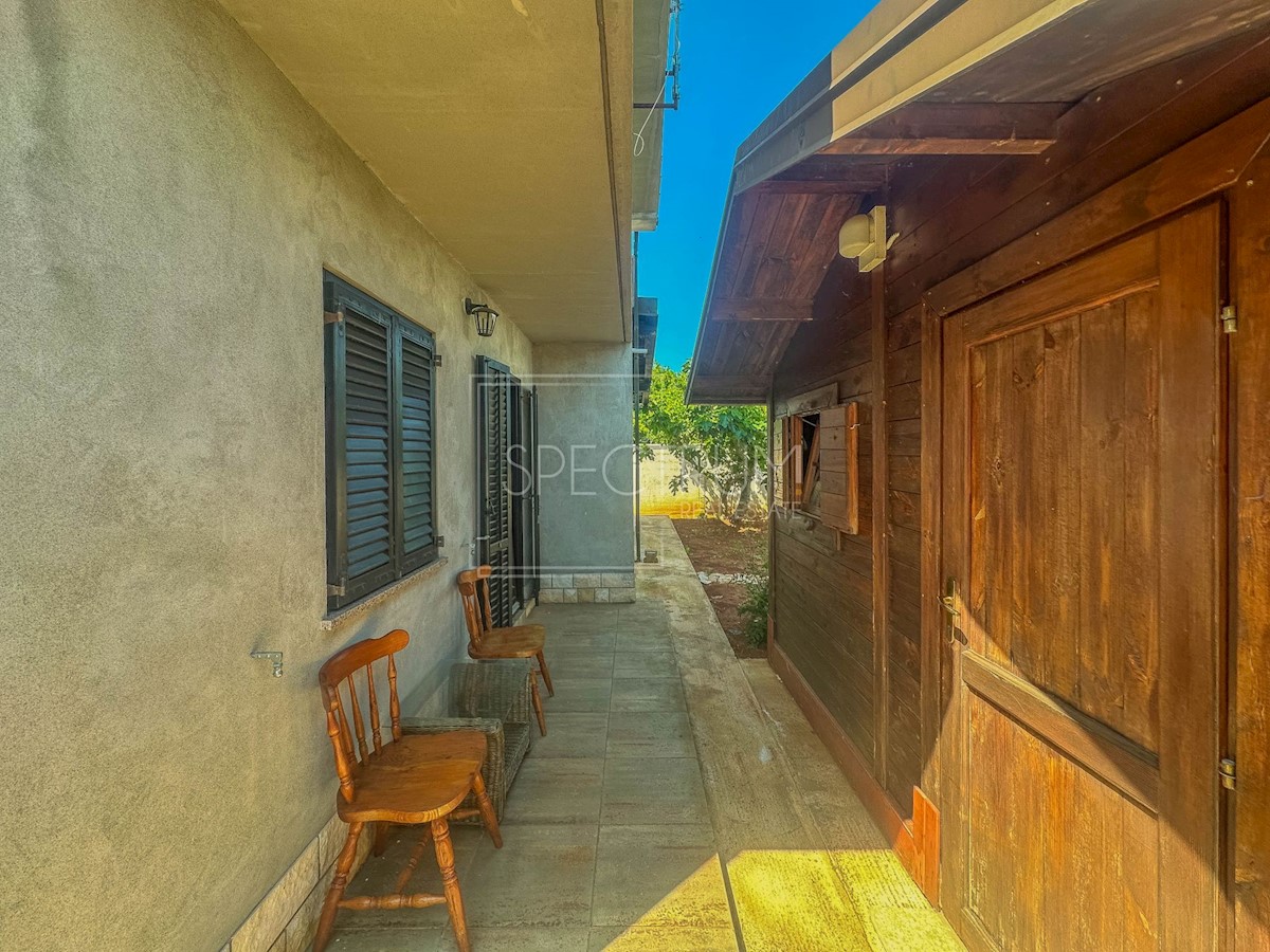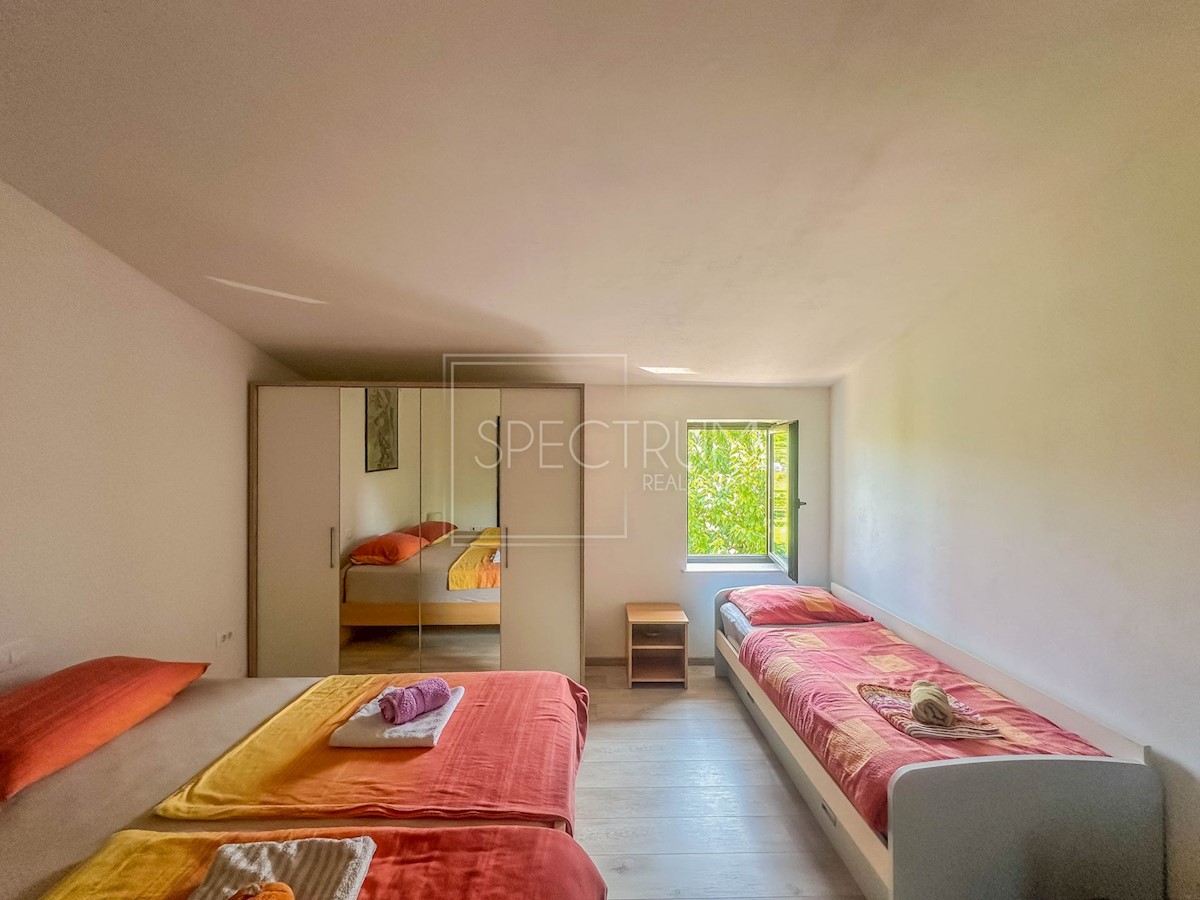 Istra, okolica Umaga Prodamo samostojno hišo 200 m od morja v okolici Umaga. Hiša se razteza skozi pritličje in prvo nadstropje, površina hiše pa je 194,21 m2. V pritličju je stanovanje, ki ga sestavljajo dnevna soba, kuhinja z jedilnico, 2 spalnici, kopalnica, WC, hodnik, shramba in terasa, idealna za uživanje na prostem. V pritličju je tudi garsonjera, ki jo sestavljata spalnica in kopalnica. Zunanje stopnice vodijo v 1. nadstropje, kjer sta še 2 stanovanja. En apartma je sestavljen iz dnevne sobe z jedilnico, kuhinje, spalnice, kopalnice, WC-ja in pokritega balkona s pogledom na morje. Poleg tega stanovanja je v prvem nadstropju še ena garsonjera, ki je sestavljena iz spalnice in kopalnice. Hiša se ogreva s klimo in pečjo na drva. Hiša je bila v letu 2020 obnovljena in napeljana nova elektro in vodovodna inštalacija. Hiša se nahaja na urejeni in ograjeni parceli velikosti 514 m2. V sklopu vrta je taverna s kopalnico, idealna za druženje. Ob hiši stojita tudi 2 vrtni hišici, ki se lahko uporabljata kot zunanja shramba. Na vrtu je tudi parkirno mesto. Hiša se nahaja na atraktivni lokaciji, le 200 m od lepih in urejenih plaž. Središče Umaga je oddaljeno nekaj minut vožnje. V bližini hiše so tudi restavracije, kavarne, promenade, kolesarske steze, park, igrišče in razni drugi objekti. Glede na to, da gre za večstanovanjsko hišo, ki se nahaja na atraktivni lokaciji, je hiša idealna za turistične namene in počitnice, pa tudi za celoletno bivanje.