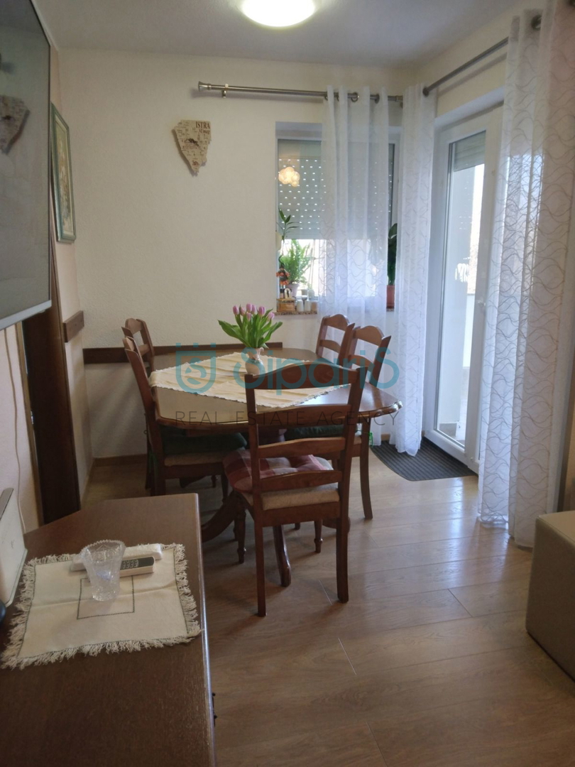 Umag, Punta, prodamo dvoetažno stanovanje v prvem nadstropju. Skupna površina stanovanja je 94,18 m2. Stanovanje je dvoetažno - prvo nadstropje obsega dnevno sobo, kuhinjo z jedilnico, dve spalnici in teraso. V drugem nadstropju je mansarda, ki je sestavljena iz manjše dnevne sobe s spalnico in zaprto ložo. Z malo predelave lahko to postane dodatno stanovanje, torej garsonjera. Ogrevanje je na pelete, hlajenje pa na klimo Stanovanju pripada garaža in shramba, ki se nahaja v kleti objekta. Nepremičnina se nahaja v bližini vseh pomembnih objektov. trgovine, šole, vrtci, zdravstveni dom, lekarna, restavracije, bencinski servis, oddaljenost od morja pa je 600 m.